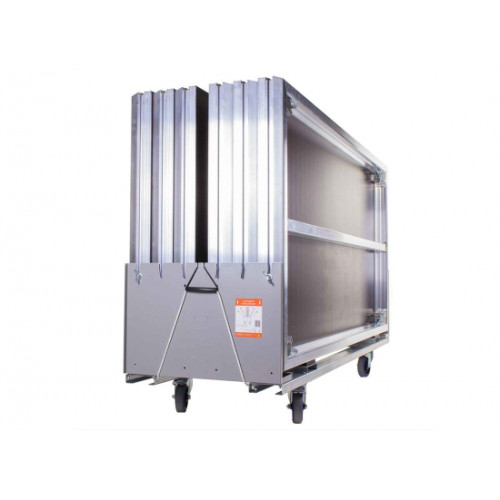 Dieser Transportwagen ist ideal für den Transport von 6 Stagedex-Podesten. Der Dolly hat eine Gesamtfläche von 59 x 105 cm. Durch diese Größe passen 4 Dollys im LKW nebeneinander. Die Podeste lassen sich leicht in die Aussparungen des Wagens schieben, und eine Abschrägung am Boden des Wagens verhindert, dass die Podeste gegeneinander schlagen. Jedes Deck kann mit einem Bolzen an der Seite des Wagens gesichert werden. Es wird empfohlen alle Podeste während des Transportes zusätzlich mit einem Spanngurt zu sichern. Es ist auch möglich, mehrere Räder unter dem Wagen zu montieren. Dieses Produkt erleichtert es deutlich, eine Rampe hinaufzufahren, oder um enge Ecken zu fahren.