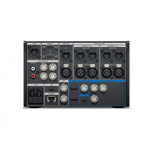 - Analoge Audioeingänge: 4 Kanäle für professionelles symmetrisches Analogaudio über XLR-Anschlüsse und 2 Kanäle für unsymmetrisches Consumer-Audio über RCA-Anschlüsse
