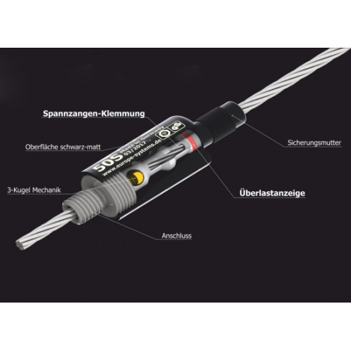 Die geforderte Erkennbarkeit einer Überlastung der Bauteile wurde bei den RopeFix S-Baureihen konstruktiv gelöst: Bei Belastung der Mechanik über den doppelten Wert der Arbeitslast (nach DGUV, BGI 810-3) hinaus, wird für den Bediener im oberen Bereich des RopeFix ein rot gefärbter Ring sichtbar. Dieser zeigt zum Einen die deutliche Überlastung und indiziert zum Anderen, dass das Bauteil aufgrund von unzulässiger Überlastung ausgetauscht werden muss.