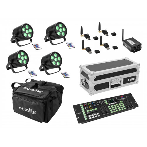 4 akkubetriebene Scheinwerfer inkl. Softbag, DMX-Controller inkl. Flightcase und DMX-Funksystem