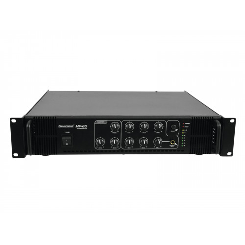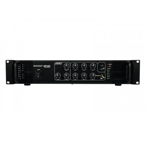Hohe Zuverlässigkeit bei maximaler Flexibilität Der Omnitronic MP-60 ELA-Mischverstärker ist Ihr verlässlicher Partner bei der Arbeit mit ELA-Beschallungsanlagen. Er ist dank seines 19"-Formats sowohl für den Mobilbetrieb als auch für Festinstallationen bestens geeignet. Ausgänge für ELA-Lautsprecher mit 70-V- und 100-V-Audioübertrager oder 4-16-Ohm -Lautsprecher lassen keine Wünsche offen. Darüber hinaus können Sie am Line-Output auch ein Gerät mit Line-Pegel (z.B. Mischpult) anschließen. Mit 6 mischbaren Eingängen sind Sie stets flexibel. Schließen Sie bis zu 3 Mikrofone und 3 Geräte mit Line-Pegel an. Durchsagen haben PrioritätDer frontseitig angeordnete Mikrofoneingang 3 verfügt über eine regelbare Prioritätsschaltung. Sie ermöglicht Ihnen, wichtige Durchsagen bei automatischer, stufenlos einstellbarer Pegelabsenkung sämtlicher Signale zu machen. Weisen sie mit Hilfe des Gongs zusätzlich auf Ihre Durchsage hin. Schutzfunktionen Ein Lüfter schützt das Innenleben Ihres MP-60 vor Überhitzung. Neben einer Einschaltverzögerung verfügt er über Schutzschaltungen gegen Überspannung und Kurzschluss. In diesen Fällen werden Ihre Lautsprecher elektrisch vom Verstärker getrennt. Die LED FAULT leuchtet dann auf und sowohl der MP-60 als auch Ihre Lautsprecher sind vor Beschädigung geschützt.ELA-Mischverstärker, 60 W RMS
