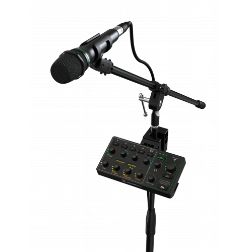 Das Mischpult lässt sich ganz einfach an einem Mikrofonstativ befestigen und für den Transport wieder in die ShowBox einsetzen.