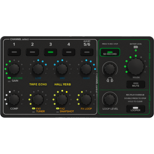 Mit dem herausnehmbaren Mischpult hat man alles zu jeder Zeit im Griff, seien es die Pegel für die Mikrofone und Instrumente, Effekte, Klangregelung, Snapshots, Looper, Stimmgerät und vieles mehr.