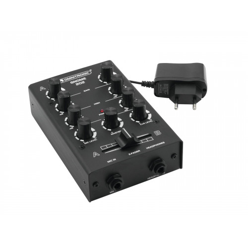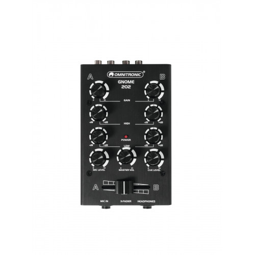 Der Omnitronic GNOME ist ein mobiles DJ-Mischpult im Miniatur-Format mit allen notwendigen Funktionen für den spontanen Mix von zwei Klangquellen (MP3-Player, Smartphone, Laptop etc.). Hierfür bietet das Pult zwei Stereo-Line-Eingänge und dazu einen regelbaren Mikrofon- und Kopfhöreranschluss. Außerdem sind DJ-typische Bedienelemente vorhanden, wie ein leichtgängiger Crossfader, ein 2-Band-Equalizer zur einfachen Klangregelung und weitere Potis. Die solide Verarbeitung macht das Mischpult nicht nur optisch zum Hingucker, sondern auch langlebig.2-Kanal-DJ-Mixer im Miniaturformat