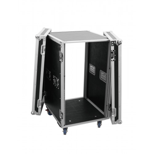 Flightcase für 483-mm-Geräte (19"), rollbarDas Verstärkerrack PR-2ST von ROADINGER ist mit Rackschienen vorne und hinten ausgestattet und ermöglicht Ihnen eine Montage Ihrer 483-mm-Geräte, wie Endstufen, Lichtendstufen und Zusatzgeräte mit 18 HE. Die beiden abnehmbaren Deckel (Double-Door-Version) sorgen für einfaches Handling. Die hochwertige Verarbeitung des Cases mit 9 mm starken Wänden, Aluminiumprofilrahmen mit abgerundeten Ecken und dreischenkligen, mittelgroßen Stahlkugelecken garantiert für hohe Stabilität.Zusätzlich verfügt das Verstärkerrack über acht hochwertige Butterfly-Schlösser und vier verchromte Case-Klappgriffe. Das Case wird mit einem Rollbrett mit vier Lenkrollen, wovon zwei eine Feststellbremse haben, geliefert.Rack-Case mit Lenkrollen