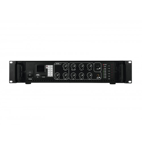 Enorme Zuverlässigkeit bei maximaler Flexibilität Der Omnitronic MPZ-120.6P ELA-Mischverstärker ist Ihr verlässlicher Partner in Sachen ELA-Beschallungsanlagen. Er ist dank seines 19"-Formats sowohl für den Mobilbetrieb als auch für Festinstallationen bestens geeignet. Ausgänge für ELA-Lautsprecher mit 70-V- und 100-V-Audioübertrager oder 4-16- Ohm -Lautsprecher lassen keine Wünsche offen. Darüber hinaus können Sie am Line-Output auch ein Gerät mit Line-Pegel (z.B. Mischpult) anschließen. Mit 6 mischbaren Eingängen sind Sie stets flexibel. Schließen Sie bis zu 3 Mikrofone und 3 Geräte mit Line-Pegel an. Steuern Sie Ihre ELA-Lautsprecher besonders komfortabel über die 6 Zonenausgänge des MPZ-120.6P an. Sie sind auf der Frontplatte separat schaltbar. Das bedeutet für Sie: Größtmögliche Anpassungsfähigkeit bei der Realisierung Ihres Beschallungskonzepts.Der MPZ-120.6P bietet Ihnen darüber hinaus einen MP3-Player mit Infrarot-Fernbedienung und blau hinterleuchteter LCD-Anzeige. Er weist sowohl einen SD-Kartensteckplatz als auch einen USB-Anschluss auf. So spielen Sie spontan und flexibel Musiktitel von einem Speichermedium Ihrer Wahl ein.Verschaffen Sie sich Gehör! Der frontseitig angeordnete Mikrofoneingang verfügt über eine regelbare Prioritätsschaltung. Sie ermöglicht Ihnen wichtige Durchsagen bei automatischer, stufenlos einstellbarer Pegelabsenkung sämtlicher Signale. Weisen Sie mithilfe des Gongs zusätzlich auf Ihre Durchsage hin. SchutzfunktionenEin Lüfter schützt das Innenleben Ihres MPZ-120.6P vor Überhitzung. Neben einer Einschaltverzögerung verfügt er über Schutzschaltungen gegen Überspannung und Kurzschluss. In diesen Fällen werden Ihre Lautsprecher elektrisch vom Verstärker getrennt. Sowohl der MPZ-120.6P als auch Ihre Lautsprecher sind so vor Beschädigungen geschützt.6-Zonen-ELA-Mischverstärker mit Audioplayer und IR-Fernbedienung, schaltbare Zonen, 120 W RMS