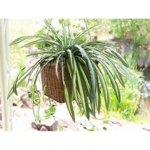 Egal ob auf der Fensterbank, im Regal, als Teil einer Hängeampel oder auf einem Podest: Grünlilien sind wahre Allrounder. Als immergrüner "Mitbewohner" fügt sich die Zimmerpflanze stilsicher in jeden Wohn- und Geschäftsbereich ein.Wie bei ihrem natürlichen Vorbild bilden auch bei dieser künstlichen Version lange, schmale, lanzettenartige Blätter aus Textil einen dichten Blattschopf mit überhängendem Wuchs. Aus mehreren, lang herabhängenden Blütentrieben haben sich bei dem Pendant einer echten Grünlilie bereits fertige Ableger (Kindeln) gebildet und geben der Kunstpflanze dadurch ein besonders naturgetreues Erscheinungsbild. Die Pflanze fällt selbständig in Form und ein praktischer Einsteckstab aus PE ermöglicht ein schnelles und unkompliziertes Dekorieren.Extrem realistisch wirkende Pflanze, fällt von selbst in Form