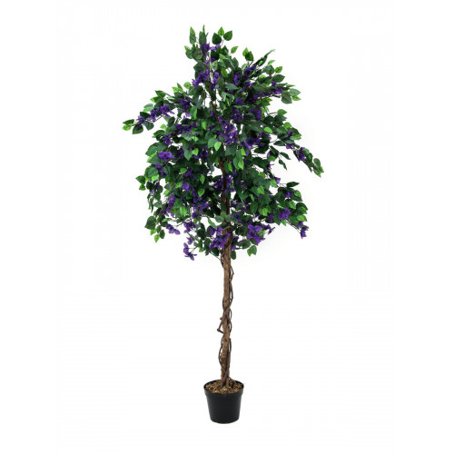 Ursprünglich stammt die echte Bougainvillea - auch Drillingsblume genannt - aus Südamerika. In südlichen Ländern finden wir die wunderschöne, in kräftigen Farben leuchtende Kletterpflanze hauptsächlich in Gärten und als Fassadenberankung.Holen Sie sich mit Europalms diesen blühenden Blickfang in Form eines wunderschönen Kunstbaumes in Ihre Räumlichkeiten.Mit einer Gesamthöhe von ca. 180 cm ist die Bougainvillea nicht zu übersehen und das ideale Dekorations-Element für Ihre Feierlichkeiten. Einen schönen Kontrast zum satten Grün der spitz zulaufenden Laubblätter bildet die intensive Farbe der Hochblätter, in deren Mitte die eigentlichen Blüten sitzen. Den Hochstamm bilden 3 Naturstämme an denen sich Lianen hochranken.Im Gegensatz zu ihrem natürlichen Vorbild, hat die künstliche Bougainvillea keine Dornen.Im Lieferumfang ist ein Basis-Gärtnertopf enthalten, welcher der Pflanze einen stabilen Stand bei Einstellen in einen Übertopf gibt.Bougainvillea