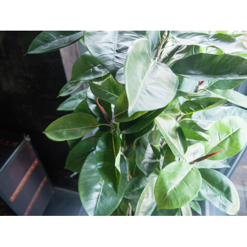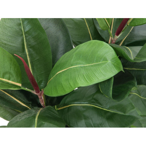 Der Gummibaum - botanisch Ficus elastica - erlebt sein Revival als Zimmerpflanze: Seine elegante Wuchsform in Verbindung mit großen, glänzenden, breitovalen Blättern verleiht selbst nüchtern eingerichteten Büro- und Wohnräumen einen tropischen Akzent.Im Gegensatz zum echten Gummibaum nimmt Ihnen diese künstliche Alternative von Europalms schwierige Lichtverhältnisse oder Zugluft nicht übel.Bei der Herstellung der Kunstpflanze wurde sehr viel Wert auf naturgetreue Details gelegt, wie die typischen rötlichen Nebenblätter, die schützend die Jungblätter der Pflanze umhüllen.Der künstliche Gummibaum hat eine Gesamthöhe von 120 cm und wird in einem schwarzen Gärtnertopf geliefert, welcher der Pflanze einen stabilen Stand beim Einstellen in einen Übertopf gibt.Gummibaum