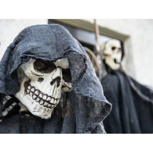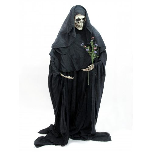 Wenn die Nächte länger und die Schatten tiefer werden, erwachen auch unheimliche Gruselgeschichten, Mythen und Legenden, in denen "Gevatter Tod" eine Rolle spielt, wieder zum Leben.Gekleidet in ein langes, schwarzes Gewand mit Kapuze, strahlt die Standfigur von Europalms eine düstere Präsenz aus. Dies wird durch ihre skelettierten Hände und dem Totenschädel, der als Gesicht dient, noch verstärkt und jagt dem Betrachter einen eiskalten Schauer über den Rücken. Unwillkürlich erinnert sie an die klassischen Symbole Gevatter Tod, Todesengel oder den Sensenmann. Auch durch ihre biegsamen Arme wird der Eindruck erweckt, nur darauf zu lauern, jeden packen zu wollen, um die Seelen der Verstorbenen ins Jenseits zu bringen.Ob im Eingangsbereich, Wohnzimmer oder im Garten - mit dieser Figur lässt sich eine perfekte Kulisse für jede Halloween-Party schaffen und sorgt für die richtige Portion Grusel bei den Gästen.Gevatter Tod