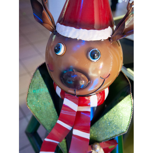 Die lebensgroßen Figuren aus Metall sind der absolute Blickfang Ihrer Winter- und Weihnachtsdekoration. Sie wurden in liebevoller Handarbeit gefertigt und jedes Stück ist ein Unikat. Die hochwertige Verarbeitung zeigt sich besonders in den aufwendigen Details jeder einzelnen Figur.Mit Hut, warmen Mantel, Strickschal und Regenschirm ist das Rentier "Rudy" bestens für die kalte Jahreszeit gerüstet. Auch ein liebevoll verpacktes Gastgeschenk hält er bereits in seiner Hand. Freundlich lächelnd begrüßt er gerne Ihre Besucher oder unterstützt die Produktpräsentation Ihres Ladengeschäfts in der Vorweihnachtszeit.Das Rentier lässt sich in wenigen einfachen Schritten zusammenbauen. Ein stabiler Bogen aus Metall, der die beiden Schuhsohlen von hinten verbindet sorgt zusätzlich für einen stabilen Stand und kann auch zur weiteren Befestigung dienen.In Handarbeit hergestellte Rentierfigur aus Metall, Farblackierung