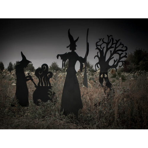 Sie planen eine Motto- oder Halloween-Party und suchen noch nach einem passenden Highlight für die entsprechend schaurige Atmosphäre? Mit den Metall-Silhouetten von Europalms setzen Sie Akzente oder gestalten eine komplette Grusel-Szenerie, die Ihre Gäste begeistern wird.In der linken Hand hält der 140 cm große Schattenriss einen Besen, während er die andere Hand Ihren Besuchern entgegen streckt. Mit spitzem Kinn, spitzer Nase und passendem Hexenhut entspricht er optisch genau einer Hexe, wie sie im Buche steht.Ein an der rechten Hand angebrachter Haken dient zur Befestigung von weiteren Dekorationselementen, wie zum Beispiel einer Laterne.Die zweiteilige Silhouette lässt sich mit wenigen einfachen Handgriffen stabil zusammen schrauben. Im Lieferumfang sind ca. 11 cm lange Erdspieße aus Metall enthalten, die sich leichthändig anbringen lassen. Somit steht auch einem Außeneinsatz in Ihrem Garten oder Vorgarten nichts im Wege.Hexensilhouette als Blickfang im Garten