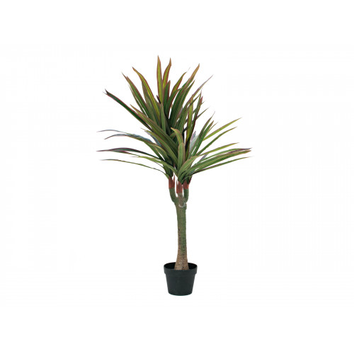 Diese pflegeleichte Alternative zum echten Drachenbaum, botanisch "Dracaena", wurde komplett aus Kunststoff hergestellt. Die langen, schmalen Blätter wurden aus hochwertigem Tarpaulin gefertigt. Ihre Ränder sind rotbraun gefärbt und stehen rundherum in ausladenden Bögen vom Kunststamm ab.Insgesamt hat die Dracena von Europalms 3 Blattschöpfe, die sich am Ende des hohen, aufrecht wachsenden PE-Stammes bilden. Mit dieser Kunstpflanze setzen Sie stilvolle botanische Akzente zu jedem Wohntrend - im Besonderen, wenn die Rahmenbedingungen keine Echtpflanzen zulassen.Die Dracaena hat eine Gesamthöhe von ca. 120 cm und wird in einem Basis-Gärtnertopf geliefert, welcher der Pflanze einen stabilen Stand beim Einstellen in einen Übertopf gibt.Drachenbaum