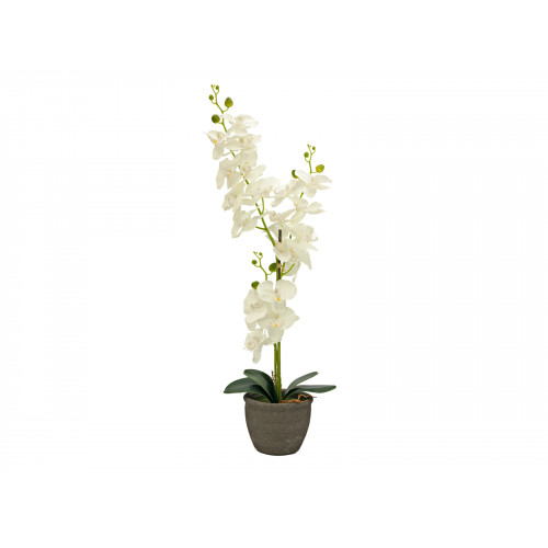 Die wilde Schönheit von Orchideen hat schon immer eine große Faszination auf Menschen ausgeübt. Allerdings gelten Orchideen-Pflanzen auch als sehr anspruchsvoll und empfindlich."Hell, aber keine direkte Sonne", "Zugluft meiden", "Regelmäßig düngen, aber nicht zuviel", "Tauchen statt gießen - aber nur mit Regenwasser", das sind nur einige der Pflegeanweisungen, die uns oft davon abhalten, diese exotischen Pflanzen zu kaufen.Die künstliche Orchidee von Europalms ist jedoch völlig anspruchslos und nimmt Ihnen keine Fehler in der Pflege übel. Sie hat 3 unterschiedlich lange Blütenstiele mit Blüten aus Textil, die sich beim Anfassen wachsartig anfühlen und somit kaum einen Unterschied zur echten Pflanze erkennen lassen. An den Spitzen der Blütenstiele befinden sich geschlossene Knospen aus PE. Leicht gebogen erreicht die Pflanze eine Gesamthöhe von ca. 80 cm.Blätter aus EVA-Material und Luftwurzeln vervollständigen das naturgetreue Erscheinungsbild.Besonders gut eignet sich die künstliche Pflanze für Fenster- oder Theken-Dekorationen im Wohn- und Geschäftsbereich.Die Pflanze wird bereits in einem Natursteinoptik-Übertopf (ca. 16cm Durchmesser) geliefert.Orchidee mit cremefarbenen Blüten im Natursteinoptik-Dekotopf