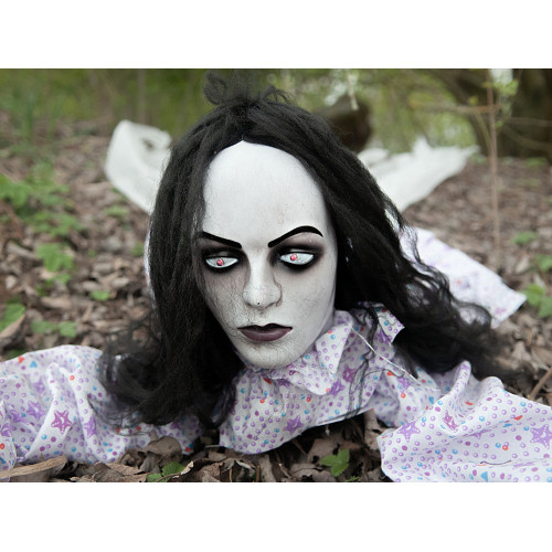 Diese animierte Halloween-Figur eignet sich sehr gut für Ihre Mottoparty, aber auch zur Dekoration von Geisterbahnen auf Volksfesten oder in Freizeitparks.In dem blassen Gesicht der jungen Frau sind deutlich die Spuren ihrer Flucht zu erkennen. Verzweifelt kriecht sie am Boden entlang, während ein schauriger Sound ertönt. Der mit einem gemusterten Kleid bekleidete Frauenoberkörper robbt durch eine eingebaute Mechanik jeweils ca. 50 cm nach vorne. Rot blinkende LED-Augen vervollständigen die Animation, welche per integriertem Mikrofon gestartet wird.Achten Sie bitte unbedingt auf ausreichend Platz, da diese Halloween-Figur von Europalms einen größeren Aktionsradius benötigt, um richtig wirken zu können.Weibliche Zombie-Dekofigur zum Legen