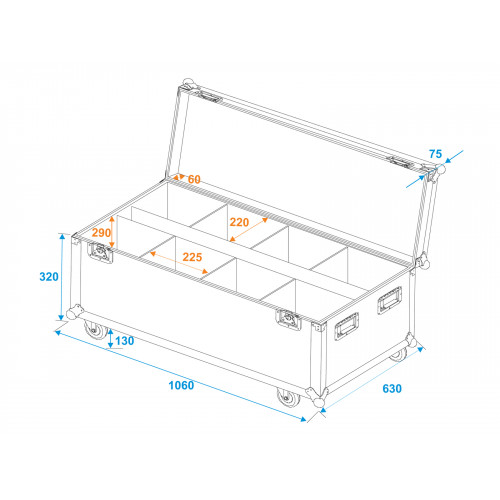 Truhen-Case mit Lenkrollen, PRO-VersionMit 4 GerätefächernMit 1 ZubehörfachInnenraum mit Schaumstoff..