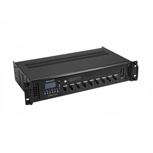 ELA-Mischverstärker mit Audioplayer, IR-Fernbedienung, 350 W RMSSD-Kartensteckplatz und USB-Anschlus..