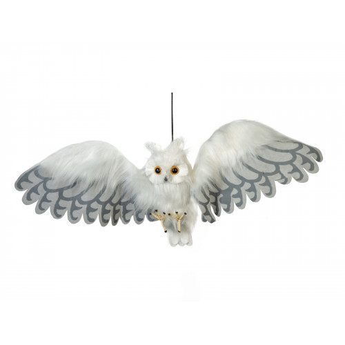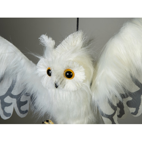 Weiße Eulen werden in mythischen Geschichten oft mit Hexerei und Magie in Verbindung gebracht.So ist die Schneeeule von Europalms eine ideale Ergänzung Ihrer Dekoration zu einer Mottoparty oder Halloween.Mit weit aufgerissenen Augen und gespreizten Fängen nimmt die junge Schnee-Eule Ihre Beute ins Visier. Ihr Körper ist mit weißem Kunstfell bezogen und die Flügelbespannung besteht aus weißem Vlies, dessen oberer Rand mit einem Streifen Kunstfell abschließt. Das Vlies ist mit der typischen grauen Maserung der Federn von Jungtieren und Weibchen bedruckt. Während sich die Flügel des Jungvogels auf und ab bewegen, blinken seine Augen rot und spitze Eulenschreie ertönen. Als Aufhängung dient eine schwarze Hängeschlaufe, welche am Hinterkopf befestigt ist.Die Animation der Hängefigur wird per integriertem Mikrofon oder kabelgebundener, manueller Steuerung aktiviert. Achten Sie vor Inbetriebnahme bitte auf ausreichend große Abstände zu anderen Objekten, da die Spannweite der Flügel ca. 75 cm beträgt.Animierte weiße Eule mit Licht-, Sound- und Bewegungseffekt