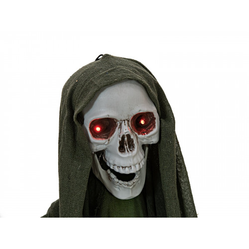 Dieses unheimliche Skelett von Europalms lehrt Ihren Besuchern als Standfigur oder Hängefigur das Gruseln.Die animierte Dekofigur ist mit einem bodenlangen, fast transparenten Gewand in Hellgrün und einem zerfetzten Überwurf aus grobem, dunkelgrünen Mullstoff bekleidet. Ein Schal aus dem gleichen Material dient als Kopfbedeckung und kaschiert die Befestigungsschlaufe am Schädel, welche als Aufhängung dient. Seine skelettierten Hände sind mit einer dicken Kette gefesselt. Durch eine eingebaute Mechanik bewegt das Skelett unter lautem Stöhnen seine Arme auf und ab und der Kopf führt Kreisbewegungen aus. Zusätzlich blinken in den Augen rote LEDs und unheimliches Kettengerassel ist zu hören.Per integriertem Mikrofon, dem Schalterpad "Step here" oder kabelgebundener, manueller Steuerung kann die Animation der Dekofigur aktiviert werden.Die Energieversorgung der Halloween-Figur kann über Batteriebetrieb, USB-A-Kabel für den 5-V-Betrieb per Powerbank oder Netzteil erfolgen.Animierte Figur mit Licht- und Soundeffekt (Batterie- & USB-Betrieb)