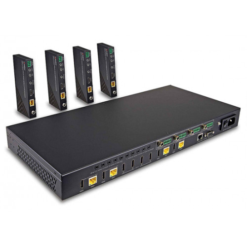 - Transmitter Ausgänge: 4 x HDMI (Buchse), 4 x Koax RCA (Buchse), 4 x L/R Audio 5-Pin Phoenix, 5 x 3.5mm IR (Buchse), 4 x RJ45 HDBaseT (Buchse)