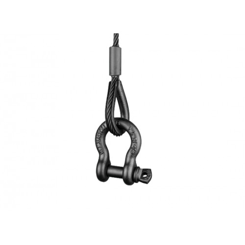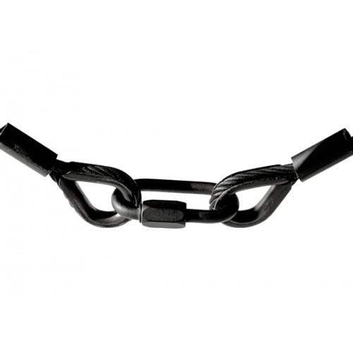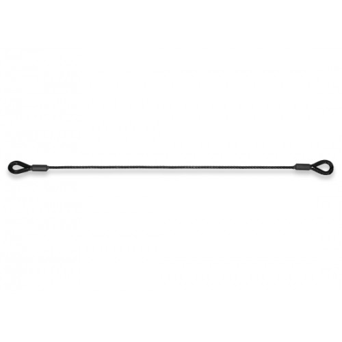 Schwarzes Drahtseil verzinkt ähnlich EN 12385-4, Konstruktion 7 x 19 mit Stahleinlage. Zwei schwarze Kauschen mit zylindrischen schwarzen Pressklemmen nach DIN 3093A. Tragfähigkeitsangaben nach DGUV.