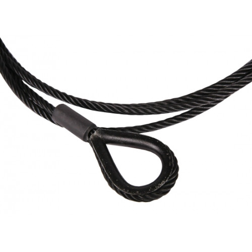 Schwarzes Drahtseil ähnlich EN 12385-4. Konstruktion 7 x 19 mit Stahleinlage. Mit einer schwarzen Kausche nach DIN 6899 Typ BF.