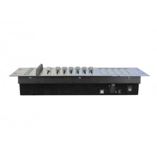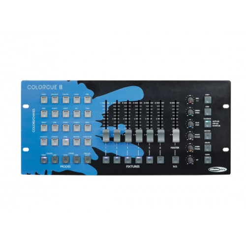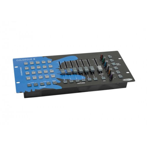 Der ColorCue 2 bietet einen Masterregler, 6 Helligkeitsregler, 6 Farbdrehreglern und 20 Speichertasten für Farben, Chases und Speicherplätze.