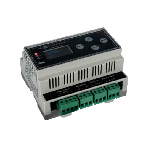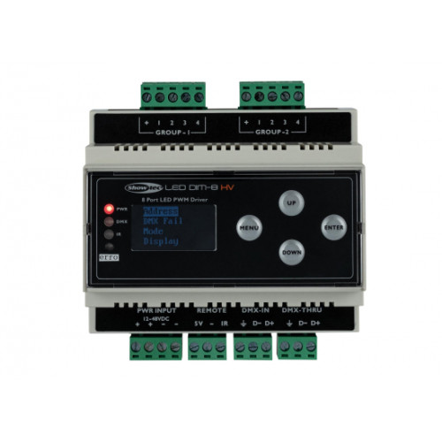 Der Showtec LED Dim-8 HV ist die Hochspannungsversion des Showtec LED Dim-8 Install und der ideale kompakte PWM-Dimmer für lange RGBW-LED-Streifen zur Festinstallation. Er bietet zwei Gruppen mit je 4 Ausgängen für die RGBW-Steuerung mit einer maximalen Ausgangsleistung von 8 A pro Gruppe, also insgesamt 16 A. Alle Verbindungen lassen sich einfach über steckbare Phoenix-Klemmen herstellen. Der LED Dim-8 HV ist sehr benutzerfreundlich und universell für verschiedene LED-Streifen konfigurierbar. Er kann 12 V bis 48 V Streifen mit konstanter Spannung über DMX oder als eigenständige Steuerung für einzelne Szenen und Chases steuern. Die Benutzeroberfläche ist sehr übersichtlich und verfügt über ein hochwertiges O-LED-Display. Der auf einer DIN-Schiene montierte LED Dim-8 eignet sich ideal für vernetzte Systemintegrationsprojekte.