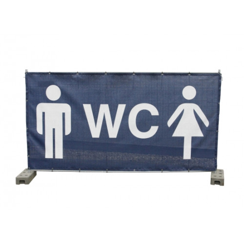 Das SweetPRO Orientierungsbanner "WC" kennzeichnet sanitäre Einrichtungen auf jedem Event. Mit den Maßen 3,40x1,75m ist die Gaze passgenau für einen Bauzaun ausgelegt. Dank der verstärkten und geösten Ränder, lässt sich die Bauzaungazen problemlos mit Spannfix oder Kabelbinder befestigen.
