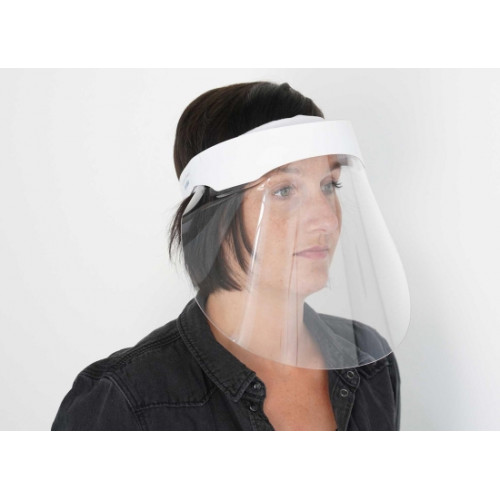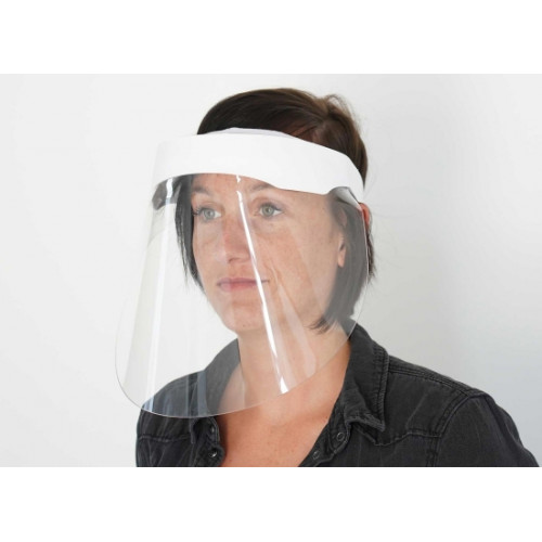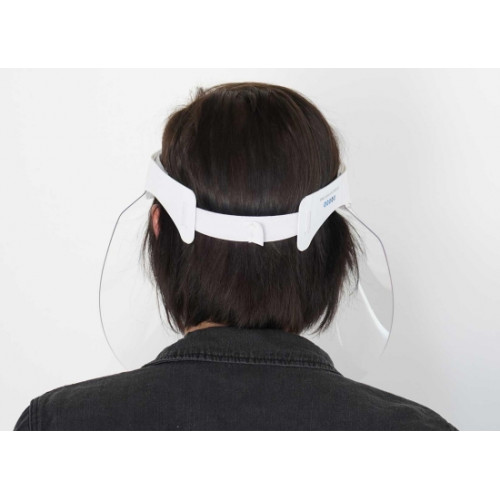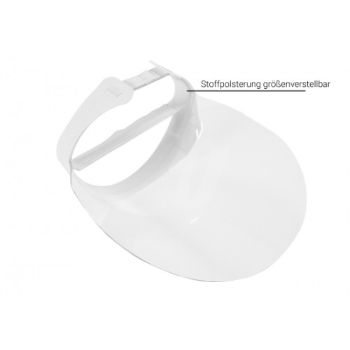 Aus durchsichtigem PETG, Hartschaum-Bügel, durch Klettband individuell verstellbar, sowie angenehme Stoffpolsterung an der Stirn.