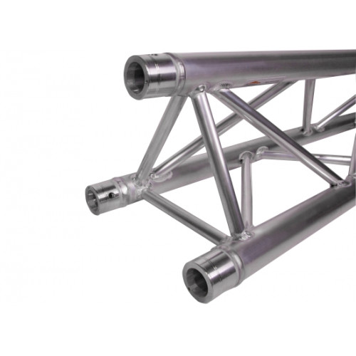 Die 3-Punkt Aluminiumtraverse findet aufgrund ihrer leichten und optisch ansprechenden Bauweise Verwendung auf kleinen Bühnen, sowie im Werbe- und Architekturbereich. Die Traversen werden über konische Verbindungselemente mit Kegelstiften untereinander verbunden.