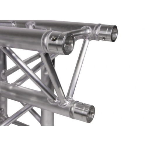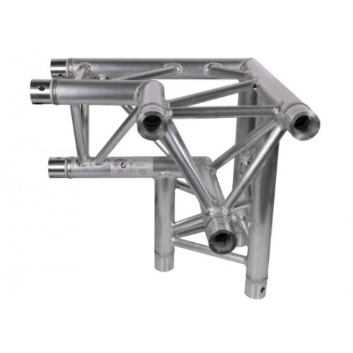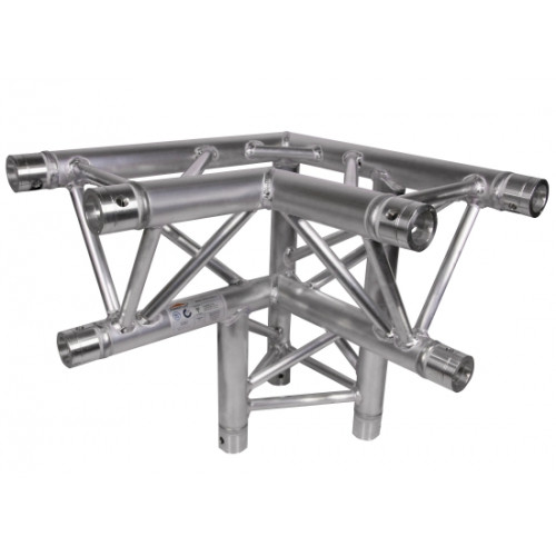 Das 3-Punkt Aluminium-Eckstück findet aufgrund seiner leichten und optisch ansprechenden Bauweise Verwendung auf kleinen Bühnen, sowie im Werbe- und Architekturbereich. Die Ecken werden über konische Verbindungselemente und Kegelstifte mit den Traversen verbunden.