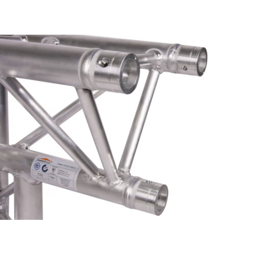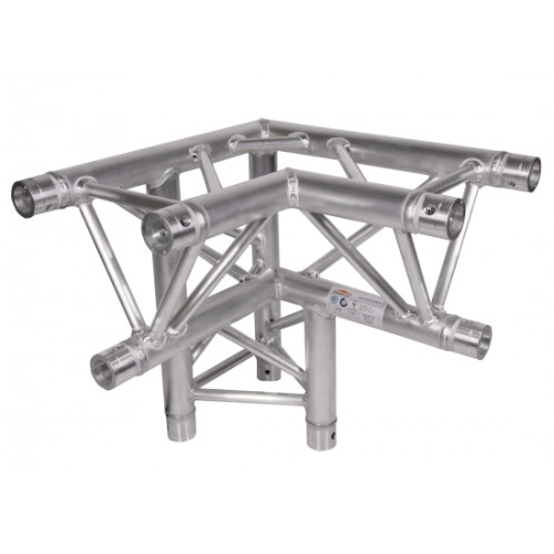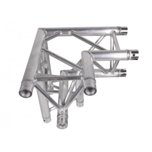 Das 3-Punkt Aluminium-Eckstück findet aufgrund seiner leichten und optisch ansprechenden Bauweise Verwendung auf kleinen Bühnen, sowie im Werbe- und Architekturbereich. Die Ecken werden über konische Verbindungselemente und Kegelstifte mit den Traversen verbunden.