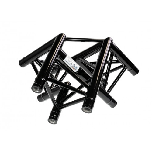 Das 3-Punkt Aluminium-Eckstück findet aufgrund seiner leichten und optisch ansprechenden Bauweise Verwendung auf kleinen Bühnen, sowie im Werbe- und Architekturbereich. Die Eckstücke werden über konische Verbindungselemente und Kegelstifte mit den Traversen verbunden.