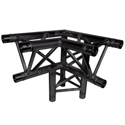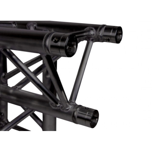 Das 3-Punkt Aluminium-Eckstück findet aufgrund seiner leichten und optisch ansprechenden Bauweise Verwendung auf kleinen Bühnen, sowie im Werbe- und Architekturbereich. Die Ecken werden über konische Verbindungselemente und Kegelstifte mit den Traversen verbunden.