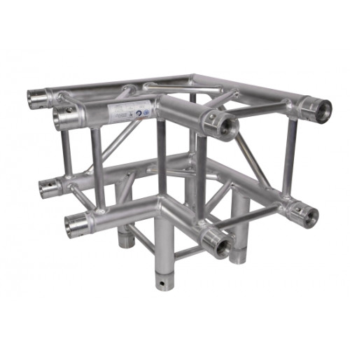 Das 4-Punkt Aluminium-Eckstück findet aufgrund seiner leichten und optisch ansprechenden Bauweise Verwendung auf kleinen Bühnen, sowie im Werbe- und Architekturbereich. Die Eckstücke werden über konische Verbindungselemente und Kegelstifte mit den Traversen verbunden.